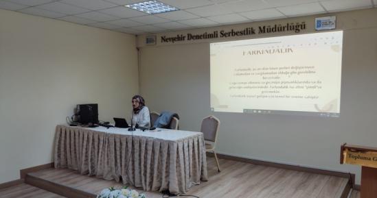 Öğretim elemanımız Arş. Gör. Feyzanur Dalkılıç Eğitim ve iyileştirme faaliyetleri kapsamında denetimli serbestlik yükümlülerine yönelik Nevşehir Denetimli Serbestlik Müdürlüğü Konferans Salonunda "Kişisel Gelişim ve Farkındalık" konulu seminer verdi. Nevşehir Denetimli Serbestlik Müdürlüğü Seminer Salonu'nda gerçekleştirilen seminerde, farkındalık, iletişim becerilerini geliştirme, duygu düzenleme becerileri, disiplin konularında bilgilendirmelerde bulunuldu. Seminere denetimli serbestlik personeli ile yükümlüler katıldı.